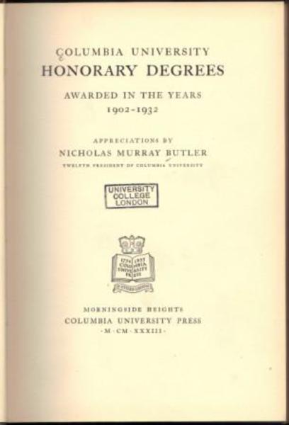 BUTLER, Nicholas Murray. (Appreciations by). Columbia University Honorary Degrees Awarded in the Years 1902-1932. Morningside Heights. Columbia University Press. 1933.