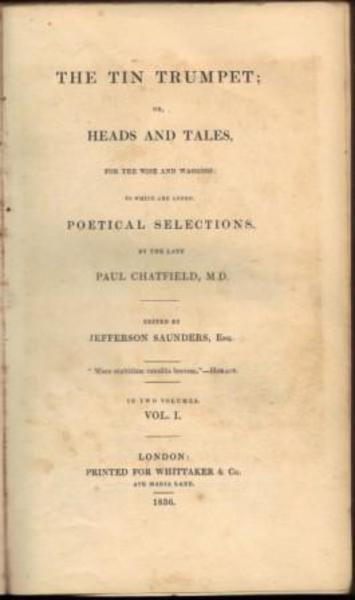 CHATFIELD, Paul. (Edited by Jefferson Saunders). The Tin Trumpet; or, Heads and Tails, for the Wise and Waggish; to Which are Added, Poetical Selections. London. Printed for Whittaker & Co. 1836.