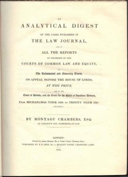 CHAMBERS, Montagu. An Analytical Digest of the Cases Published in the Law Journal, and in all the Reports of Decisions in the Courts of Common Law and Equity, in the Ecclesiastical and Admiralty Courts......to Trinity Term 1831 Inclusive. London. E.B.Ince. 1835.