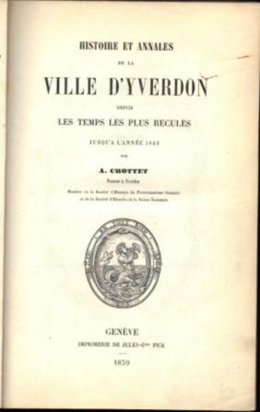 CROTTET, A. Histoire Et Annales De La Ville D'Yverdon Depuis Les Temps Les Plus Recules Jusqu'a L'Annee 1845. Geneva. Jules-Gme.Fick. 1859.