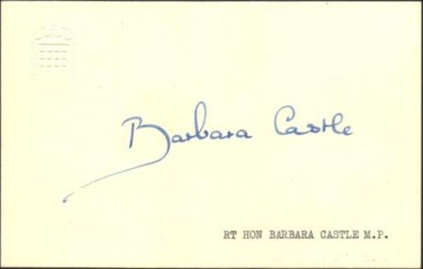 CASTLE, Barbara. (Labour MP, MEP and Minister). Autograph. No date.