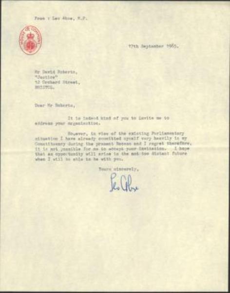 ABSE, Leo. (Welsh Labour MP). Typed Letter Signed to Mr. David Roberts. 17th September 1965.