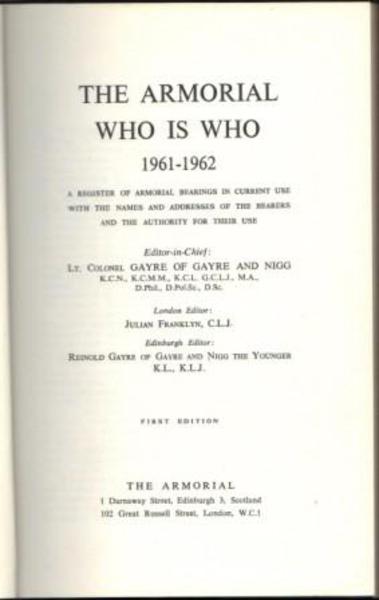 GAYRE OF GAYRE AND NIGG, Lt.Colonel. (Editor in Chief).(London editor: Julian Franklyn; Edinburgh editor: Reinold Gayre of Gayre and Nigg the Younger). The Armorial Who is Who 1961-1962. A Register of Armorial Bearings in Current Use with the Names and Addreses of the Bearers and the Authority for their Use. Edinburgh. The Armorial. No date. (First edition).