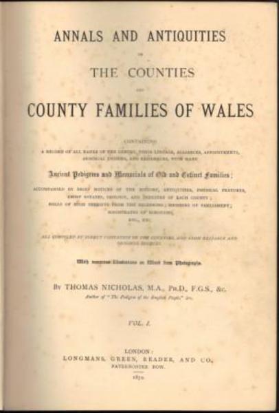 NICHOLAS, Thomas. Annals and Antiquities of the Counties and County Families of Wales Containing a Record of all Ranks of the Gentry, their Lineage, Alliances, Appointments, Armorial Ensigns, and Residences,......from Reliable and Original Sources. London. Longmans, Green, Reader, and Co., 1872. (Vol.1. A-D).