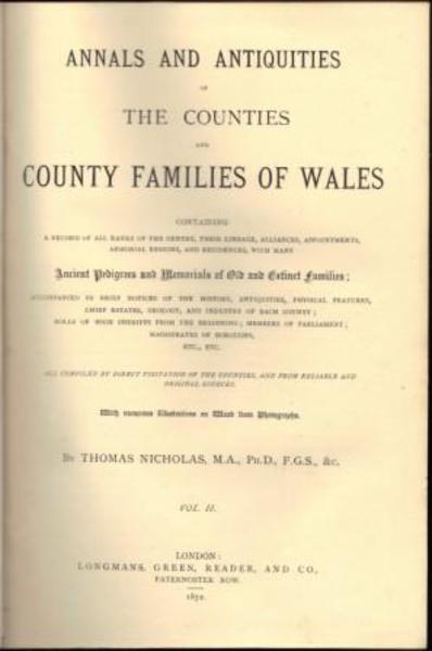 NICHOLAS, Thomas. Annals and Antiquities of The Counties and County Families of Wales Containing a Record of all Ranks of the Gentry, their Lineage, Alliances, Appointments, Armorial Ensigns, and Residences,......from Reliable and Original Sources. London. Longmans, Green, Reader, and Co., 1872. (Vol, II. F-R).