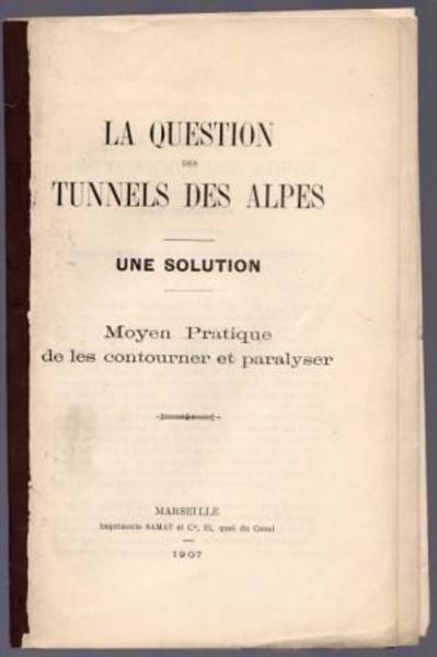 (THERYC, Charles). La Question des Tunnels des Alps. Une Solution. Moyen Practique de les contourner et paralyser. Marseille. SAMAT et Cie. 1907.