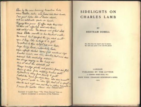 DOBELL, Bertram. Sidelights on Charles Lamb London. Published by the Author. 1903.