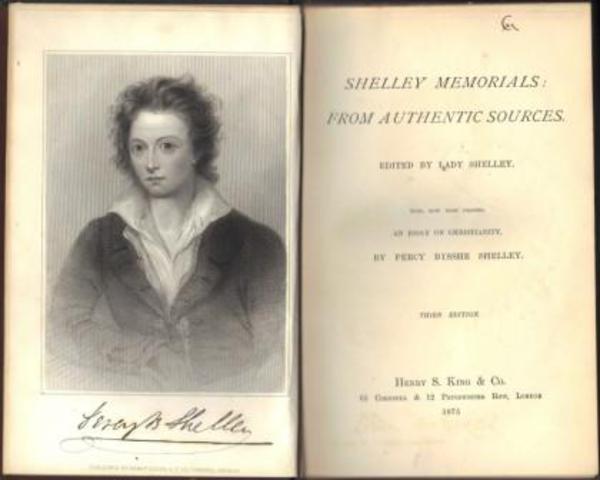 SHELLEY, Lady. (Edited by) and Percy Bysshe Shelley. Shelley Memorials : From Authentic Sources. With, now first printed an Essay on Christianity by Percy Bysshe Shelley. London. Henry S. King & Co. 1875. (Third edition).