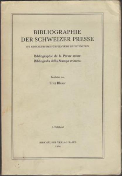 BLASER, Fritz. Bibliographie der Schweizer Presse Mit Einschluss des Furstentums Liechtenstein = Bibliographie de la Presse Suisse = Bibliografia della Stampa Svizzera. Basel. Birkhauser. 1956. (1. Halbband).