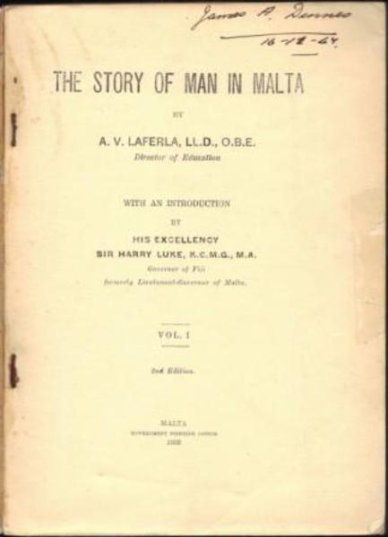 LAFERLA, A.V. The Story of Man in Malta. Vol. I. Malta. Government Printing Office. 1939. (2nd edition).