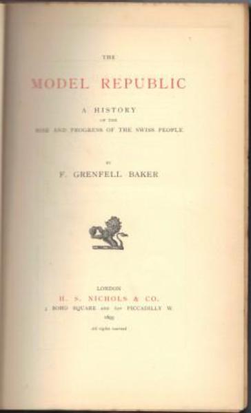 BAKER, F.Grenfell. The Model Republic : A History of the Rise and Progress of the Swiss People. London. H.S.Nichols & Co. 1895. (First edition).