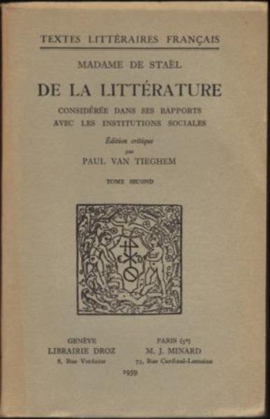DE STAEL, Madame.(and Paul Van Tieghem) De La Litterature Consideree dans ses Rapports avec les Institutions Sociales. Tome Second. Geneva. Librairie Droz. / Paris. M.J. Minard. 1959.