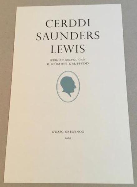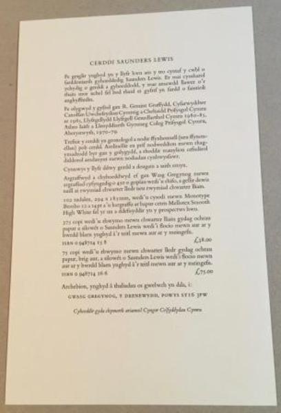 GWASG GREGYNOG. Prospectus for CERDDI SAUNDERS LEWIS. Gwasg Gregynog. 1986.
